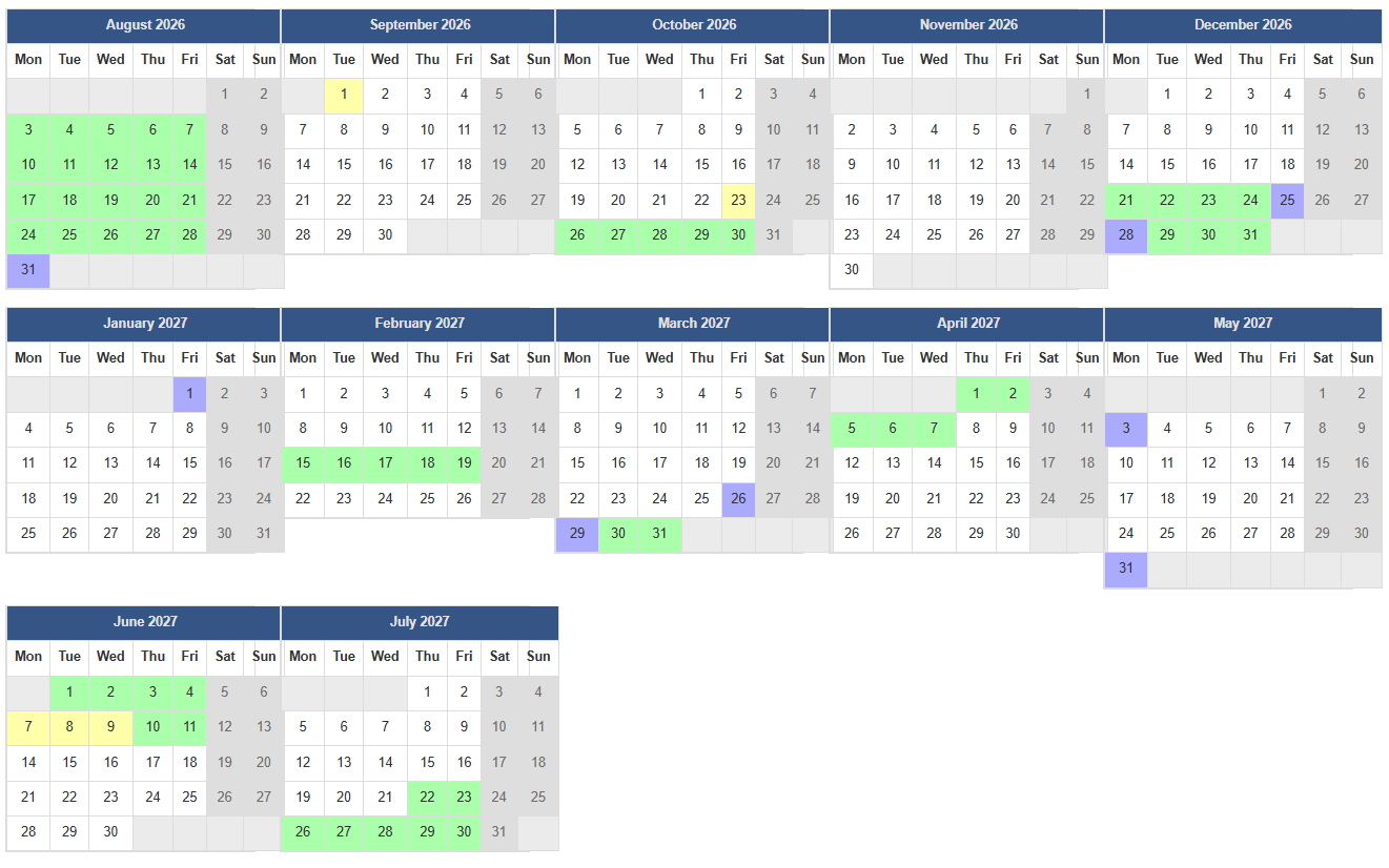 Welcome back on Monday 14th June 2027 - Break up on Wednesday 21st July 2027